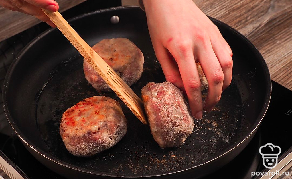 Обжарьте котлеты из индейки с грибами. Для этого разогрейте сковороду, влейте масло и выложите котлеты. Обжарьте с одной стороны около 4-5 минут, переверните и закройте сковороду крышкой. Продолжайте жарить до румяности, еще около 5-7 минут. Готовые котлеты выложите на бумажное полотенце, чтобы удалить излишки масла.
