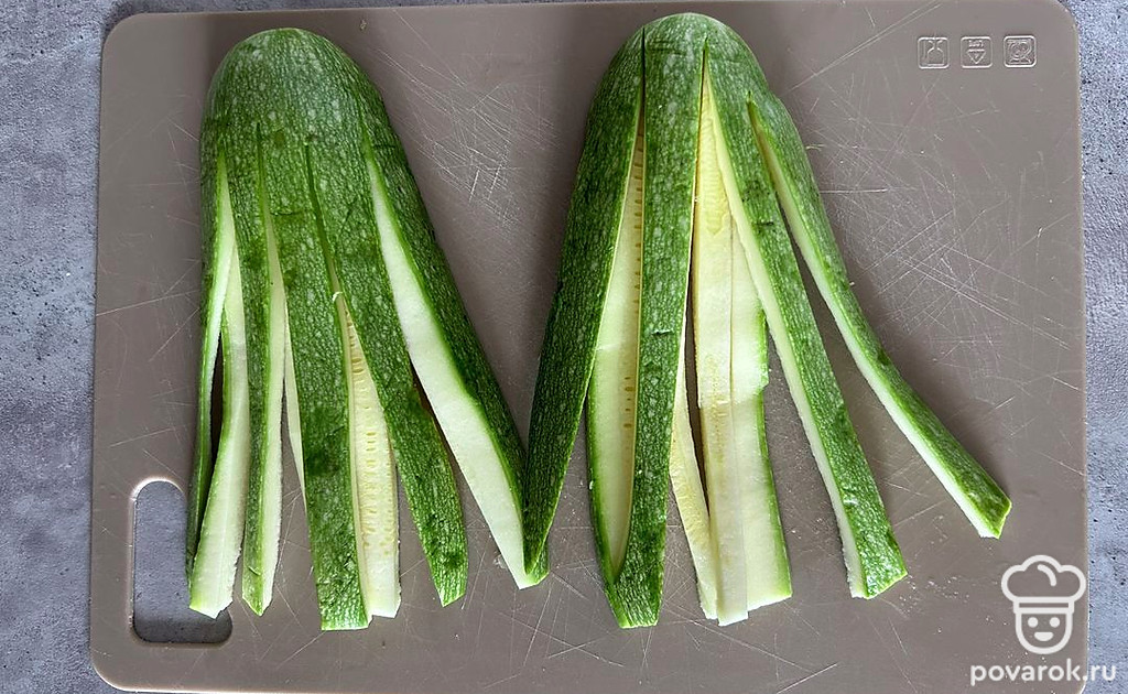 Кабачок промойте, разрежьте вдоль на 2 части. Затем каждую половину еще раз разрежьте вдоль, не дорезая до основания. Каждую половинку разрежьте на тонкие продольные полоски.