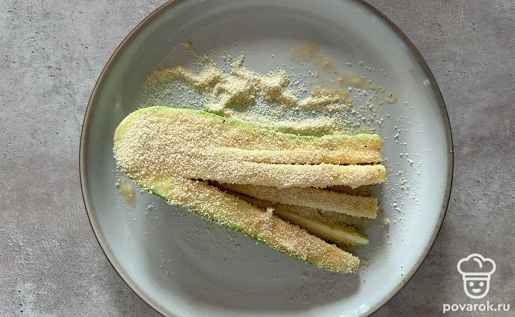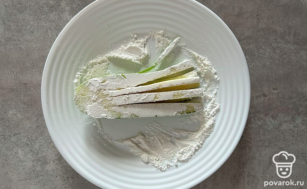 Смешайте кукурузный крахмал с рисовой мукой, обмакните в эту смесь кабачок.