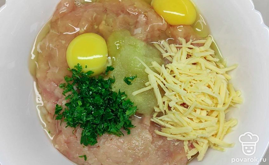 В глубокую миску выложите фарш. Добавьте к нему яйца, масло и специи по вкусу. Лук натрите в пюре, зелень мелко покрошите и выложите к фаршу. Хорошо перемешайте полученную смесь.