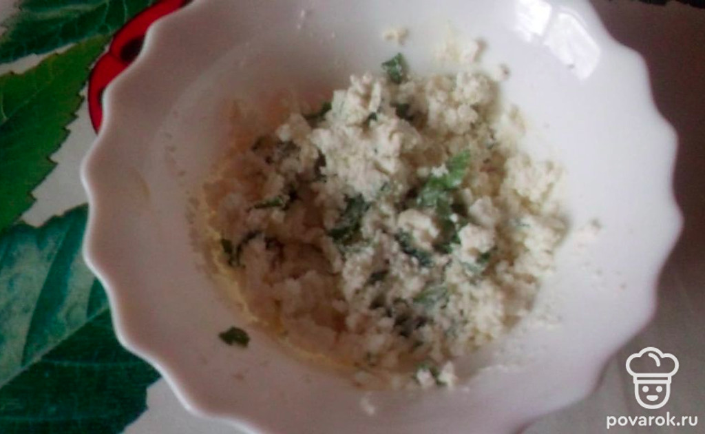 Промойте и нарежьте зелень петрушки. Смешайте творог со сливочным маслом, добавьте зелень. Начинку посолите, поперчите и перемешайте.