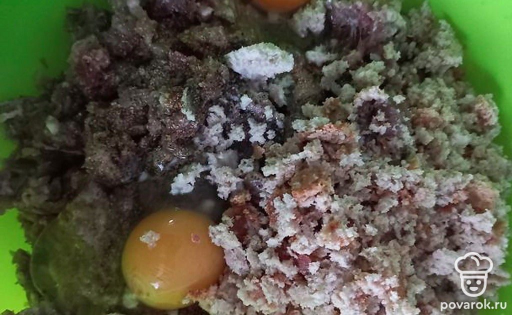 Добавьте яйца, хлеб, соль и перец.