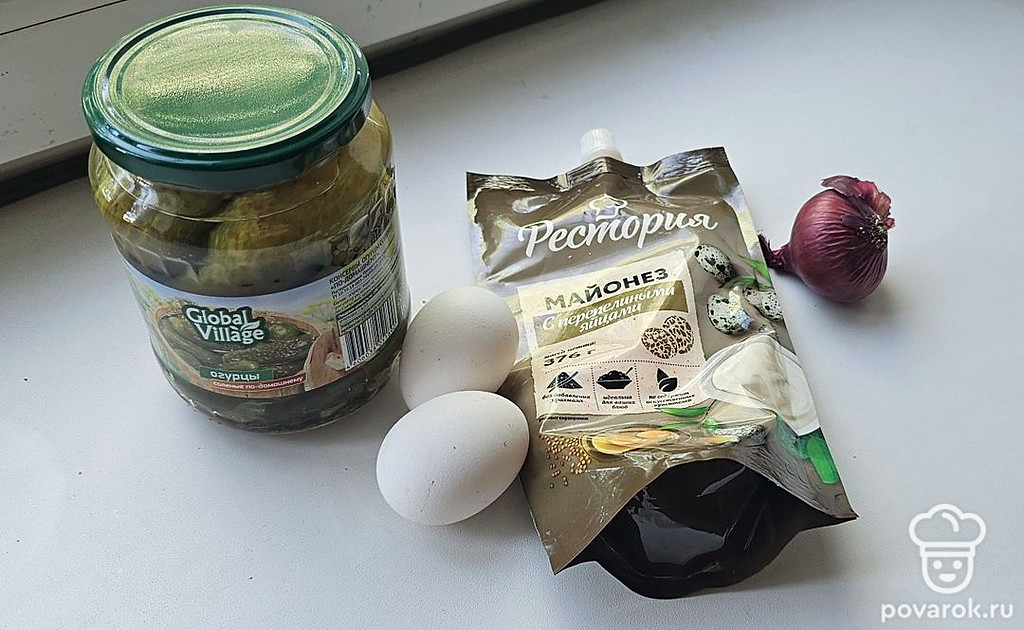 Помните желток, натрите огурец и мелко нарежьте лук. Добавьте майонез, хорошо перемешайте.