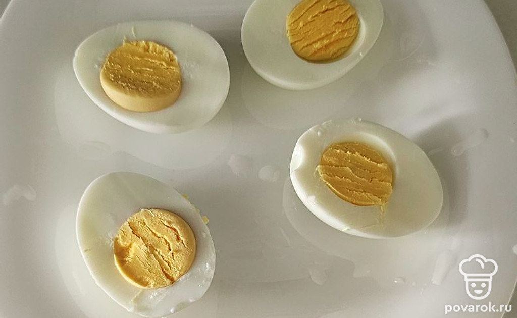 Отварите яйца и разрежьте пополам.