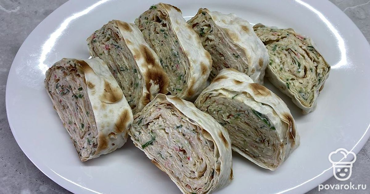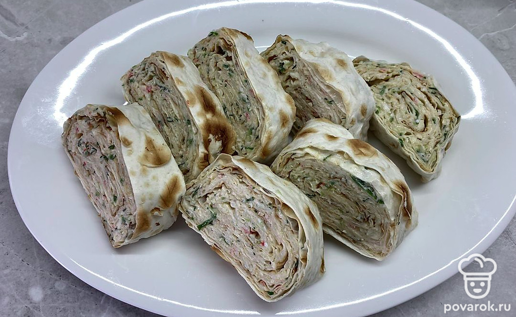 Рулет из лаваша с сыром, яйцом, огурцом и крабовыми палочками