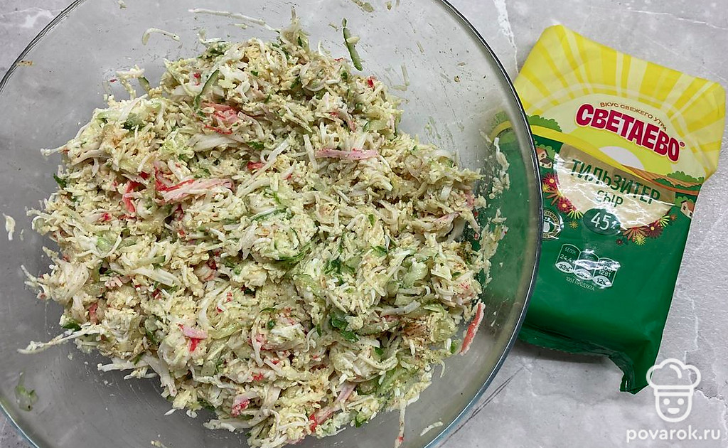 На мелкой терке натрите очищенные от скорлупы яйца, сыр, крабовые палочки и огурец. Хорошо перемешайте начинку.