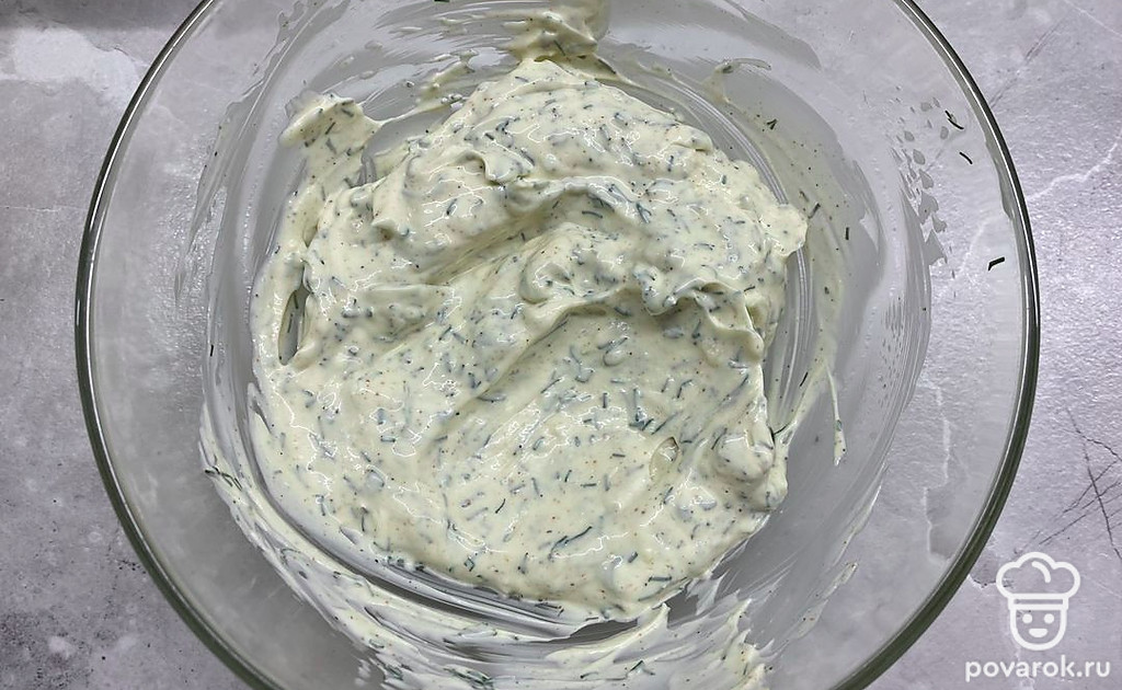 В отдельной миске смешайте майонез, измельченный чеснок и мелко нарезанную зелень. Добавьте щепотку соли, паприку и черный молотый перец по вкусу. Хорошо перемешайте.