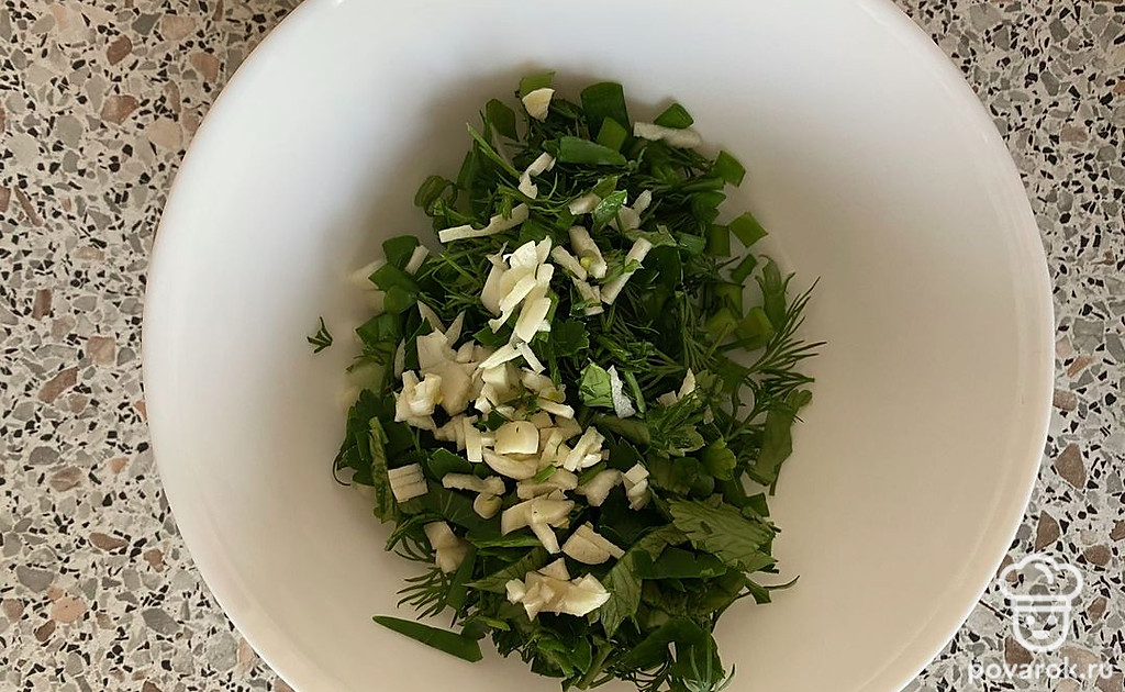 Зелень и чеснок мелко порубить.