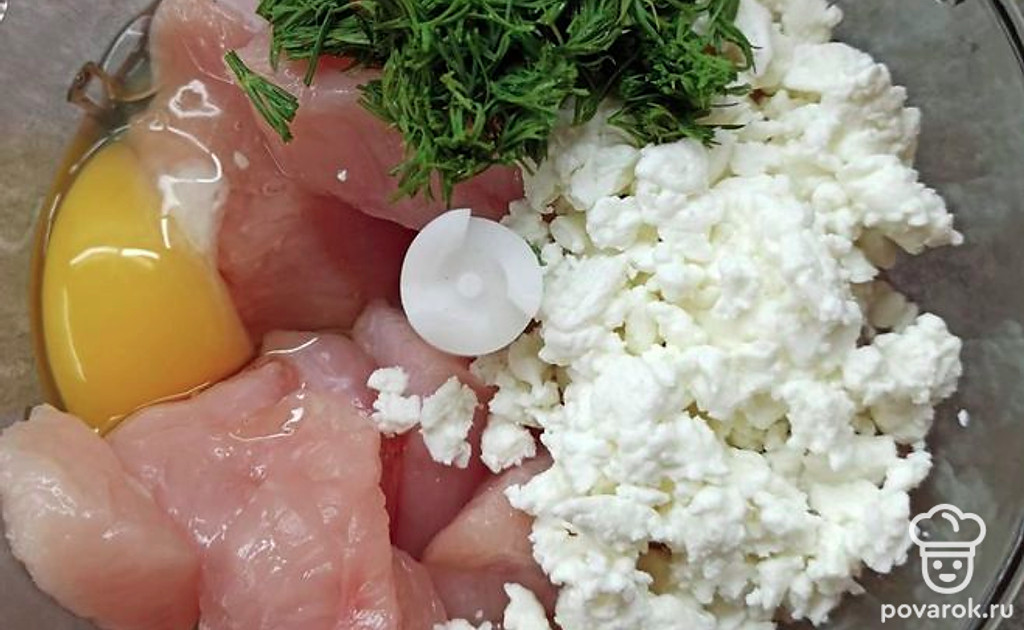 В блендере измельчаем индейку с творогом, яйцом и зеленью.