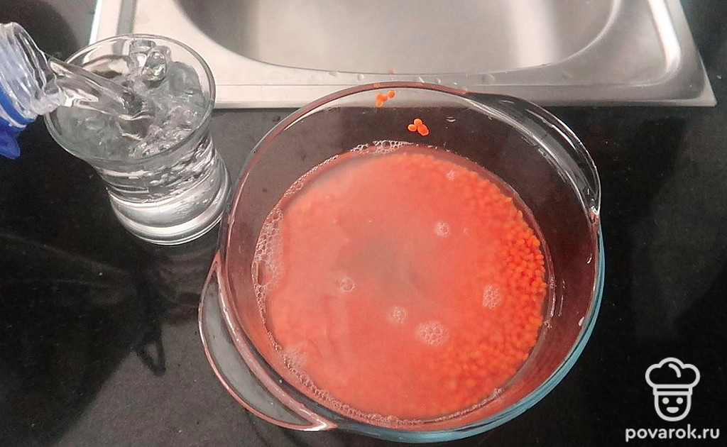 Промойте чечевицу, залейте тремя стаканами воды и поставьте на плиту вариться до кашеобразного состояния. Подсолите после закипания.