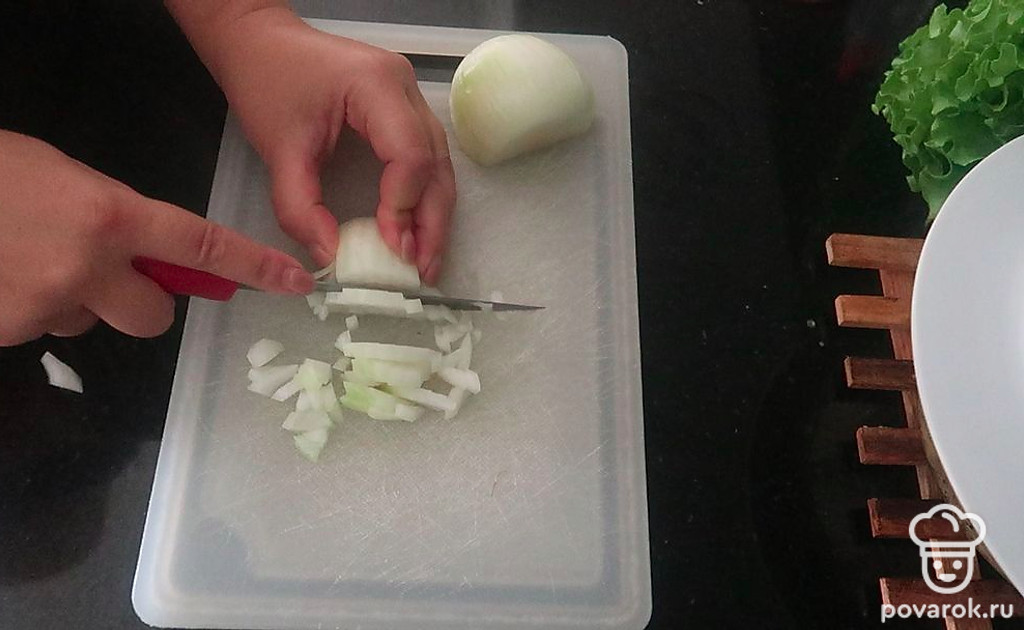 Тем временем мелко нарежьте луковицу и отправьте на сковородку обжариваться.