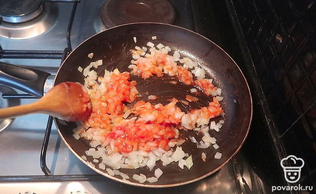 Когда лук станет золотистым, добавьте 2 ложки томатной пасты и перемешайте.
