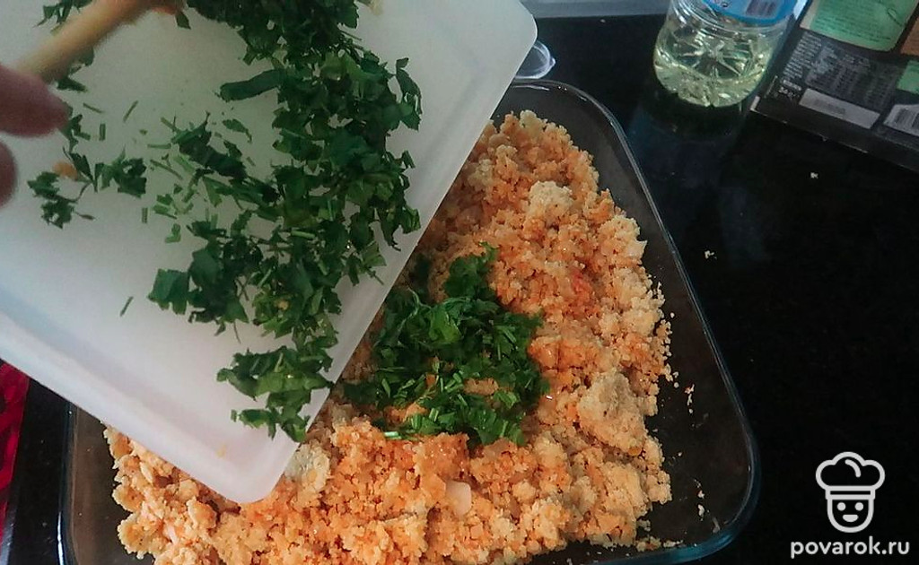 Соберите котлеты. К булгуру и чечевице добавьте специи, зелень, лук с томатной пастой и хорошо перемешайте. Если кажется, что суховато, добавьте немного растительного масла.