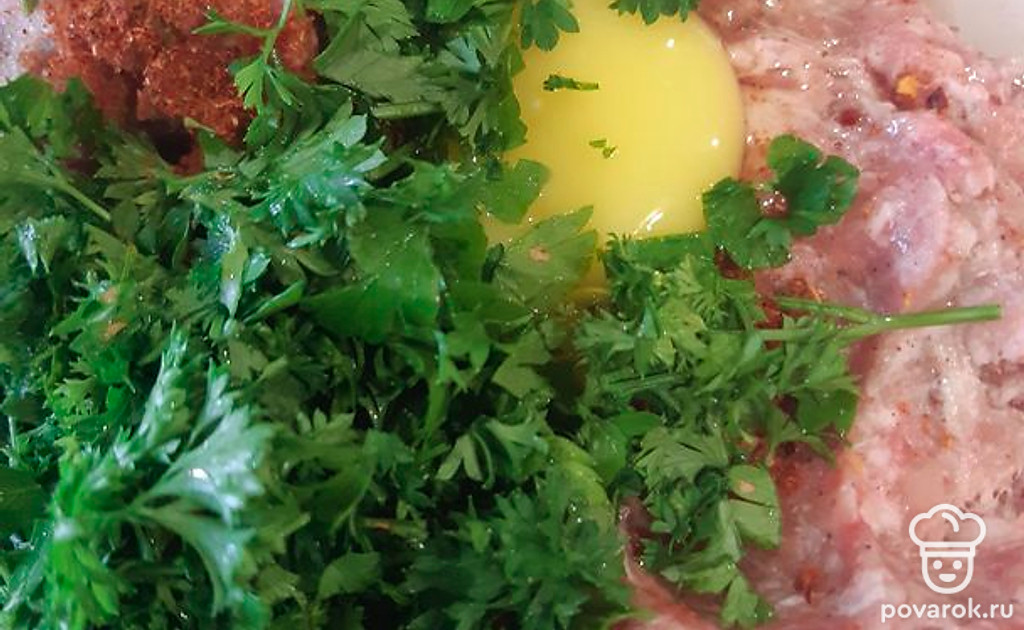 В фарш вбить яйцо, положить мелко нарезанную петрушку, перемешать.
