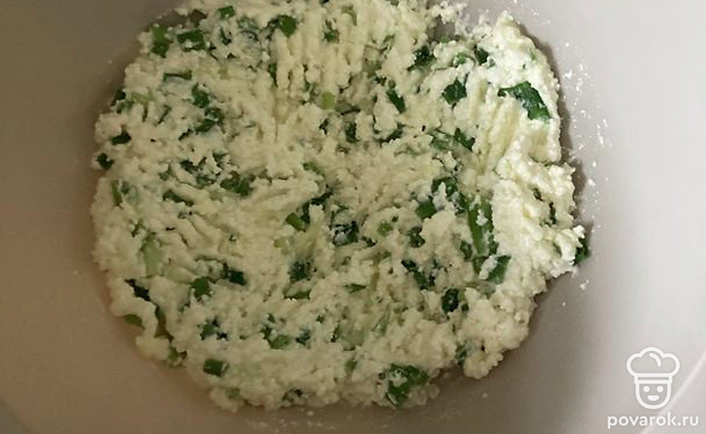 Смешайте в одной емкости творог, тертый сыр, яйцо, зеленый лук и соль.