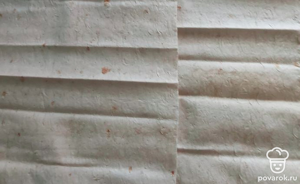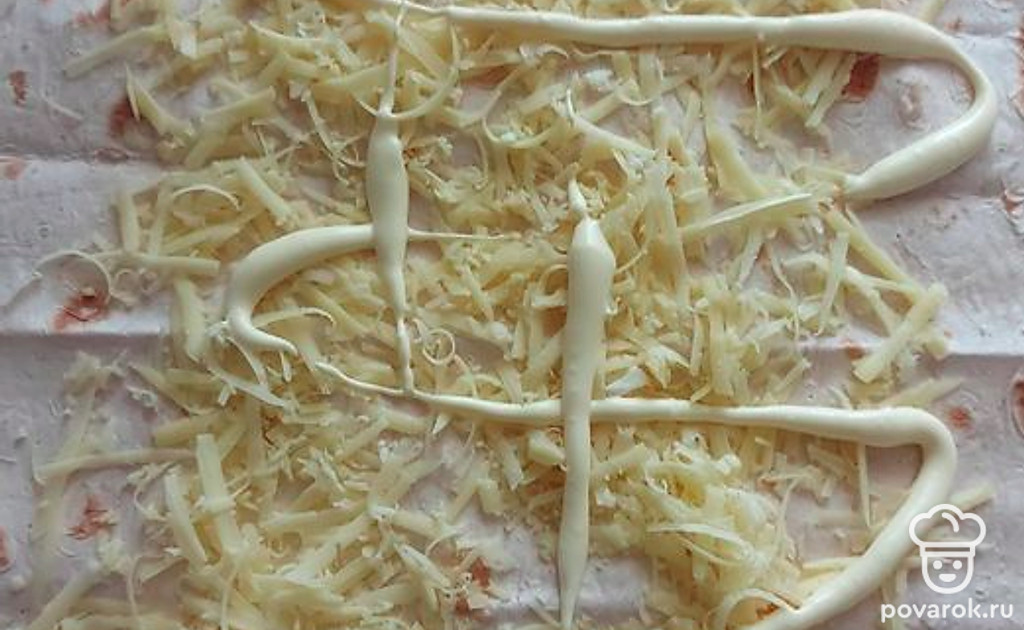 Сверху положите лаваш. Натрите сыр на крупной терке, чеснок — на мелкой терке. Выложите все на лаваш. Тоже смажьте майонезом.