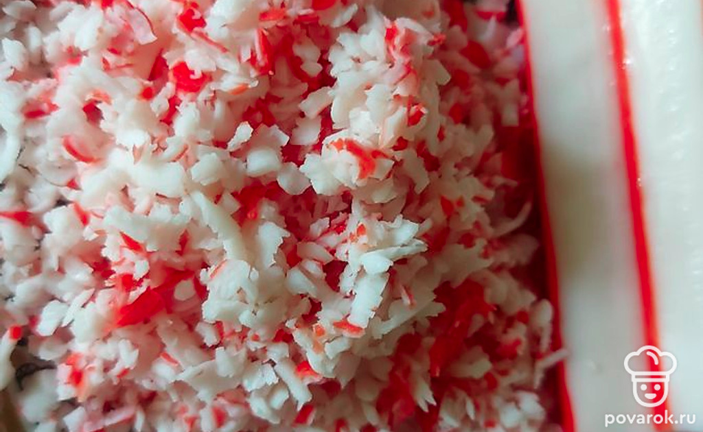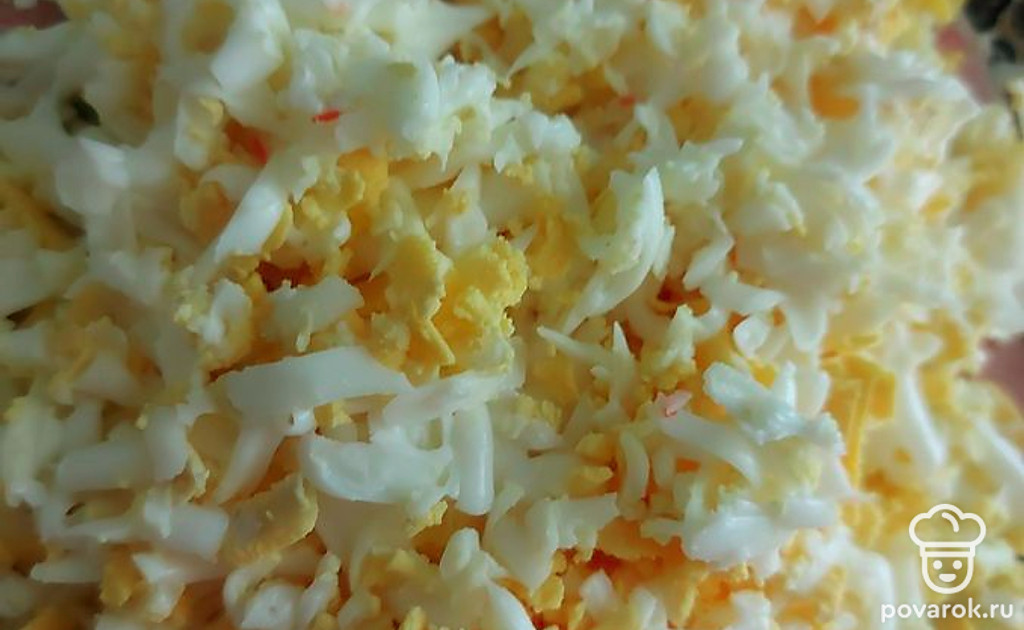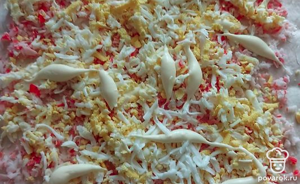 Выложите яйца поверх крабовых палочек. Приправьте майонезом.