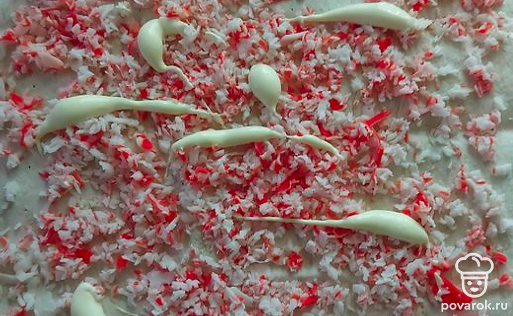 Разложите палочки на лаваш. Сверху смажьте майонезом.