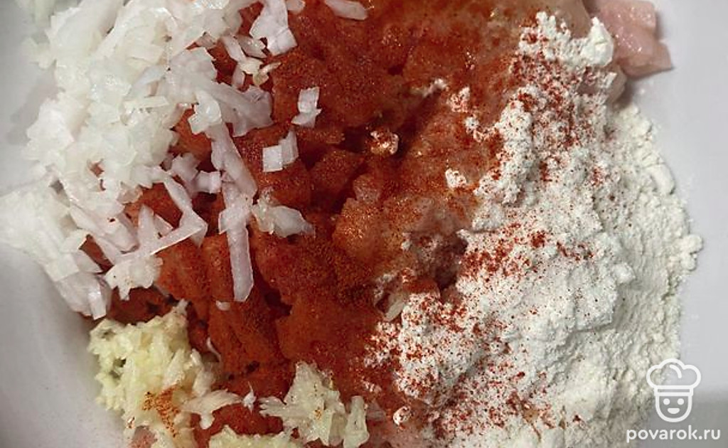 Смешиваем муку, курицу, яйцо, лук, соль, паприку, чеснок, майонез.