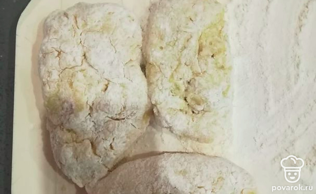 Лепим кружок на доске. В него кладем начинку из мяса и скрепляем кончики, обваливаем в муке.