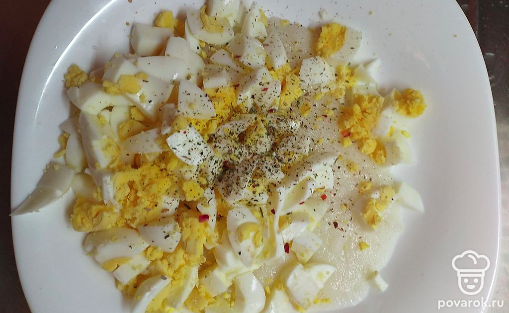 Яйца порезать на кубики, добавить к остывшей манке, посолить, поперчить.