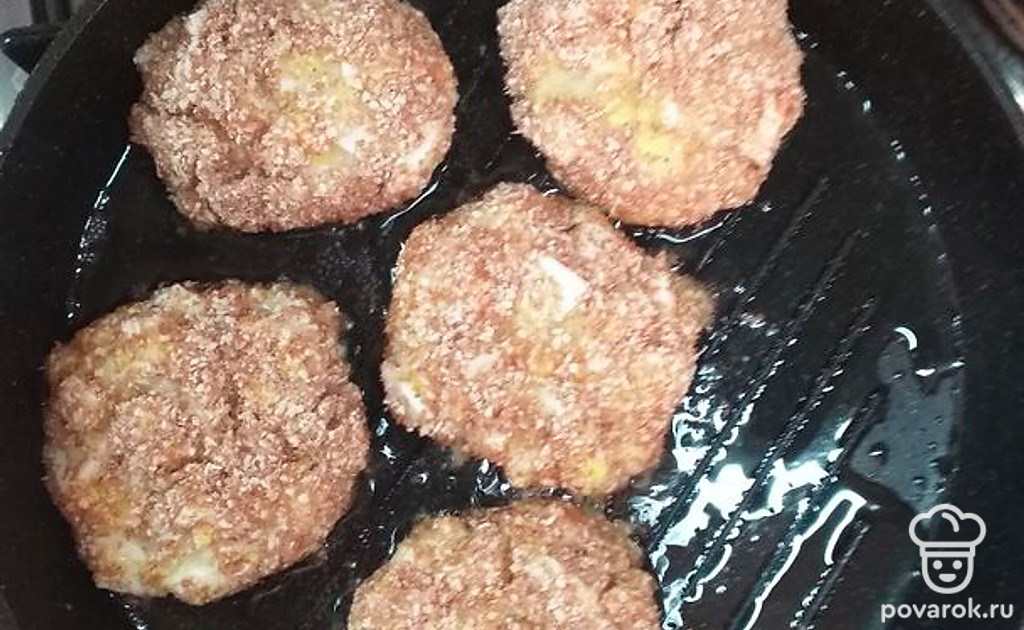 Мокрыми руками формировать котлетки, обмакивать в панировочные сухари и выкладывать для жарки на сковороду с растительным маслом.