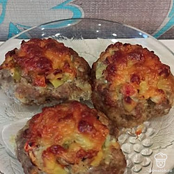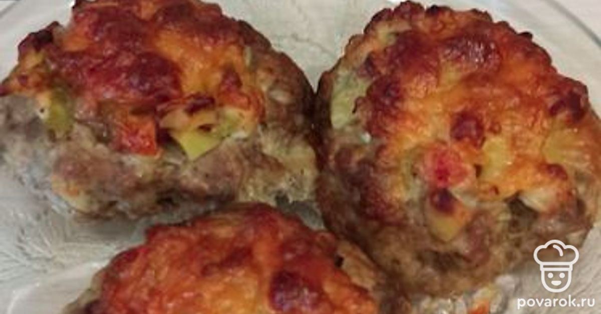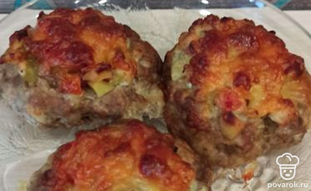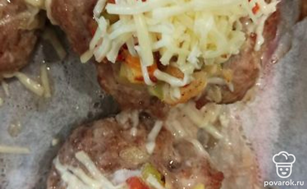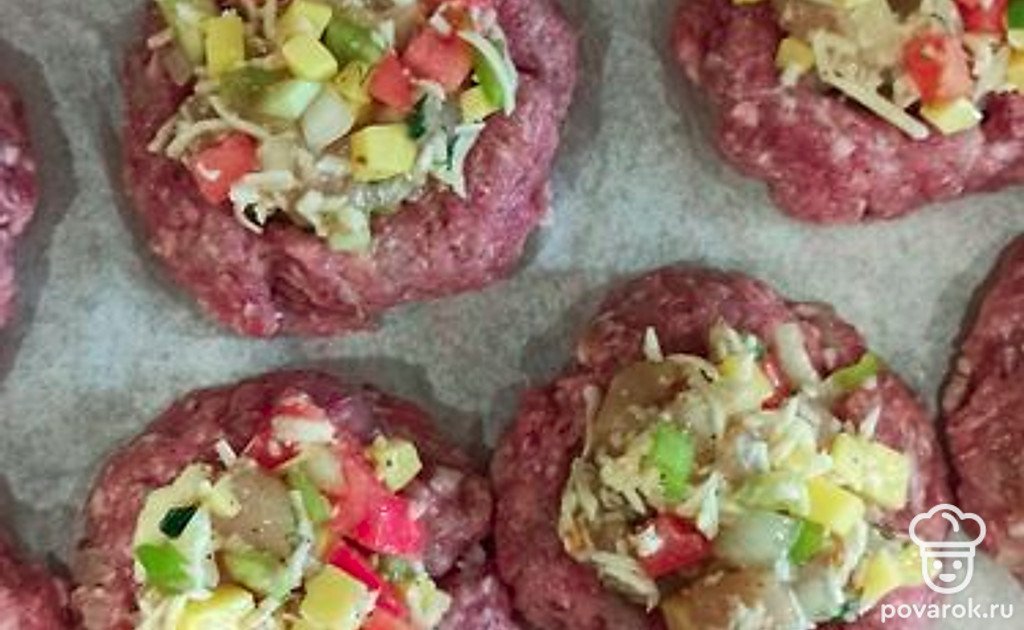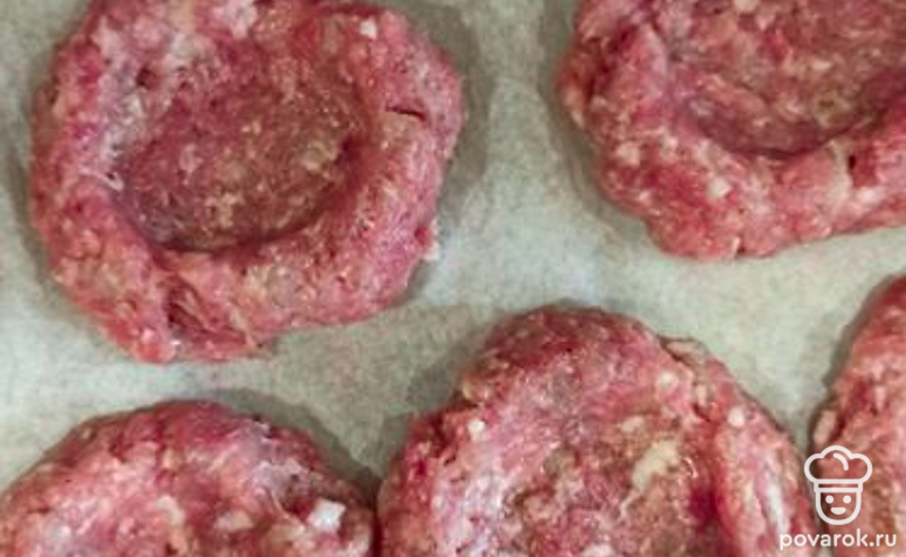 Из фарша скатать шарики, выложить на противень, придавить и в центре сделать углубление.