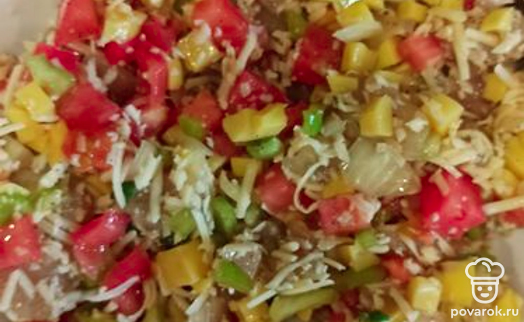 Курицу, лук (1шт), картошка, помидор, перец порезать кубиками, добавить половину натертой моцареллы и специи.