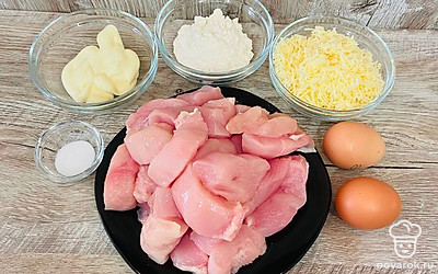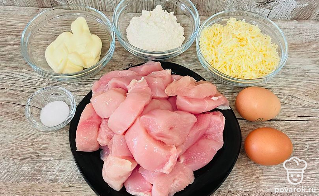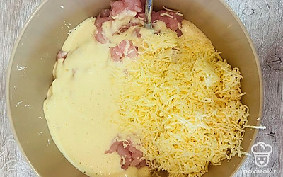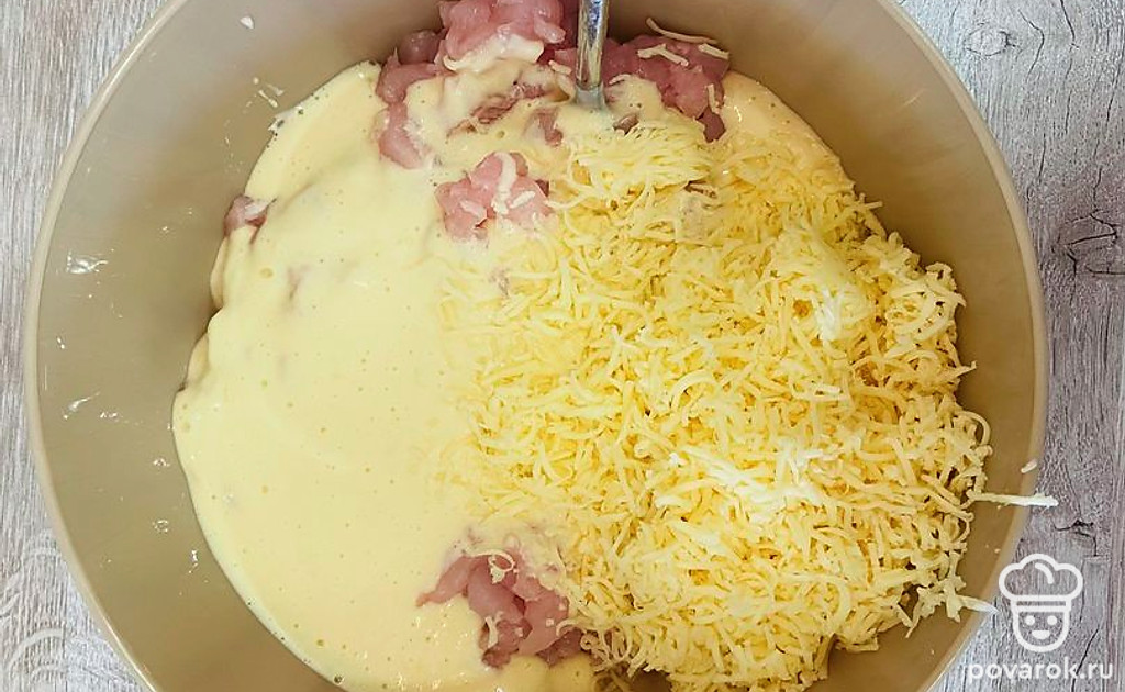 Добавьте полученную смесь и сыр к куриному филе. Перемешайте.