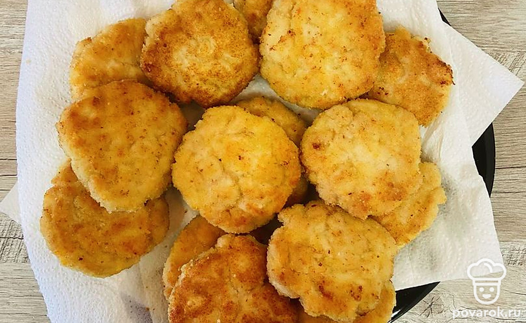 Обжарьте куриные котлеты на сковороде с растительным маслом с каждой стороны до золотистой корочки. Котлеты при желании можно обвалять в сухарях, тогда получится аппетитная хрустящая корочка и более правильная форма. Если нет желания выпекать с сухарями, то выкладывайте котлеты на сковородку столовой ложкой, так будет удобно. После жарки котлеты выложите на бумажные салфетки чтобы удалить лишнее масло.