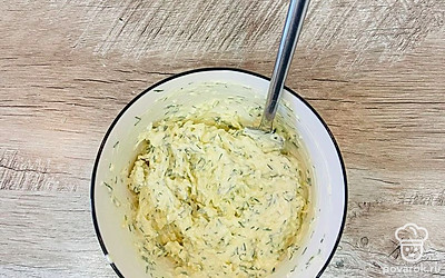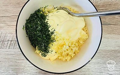 К натертому сыру добавьте майонез, укроп и чеснок по желанию. Перемешайте.