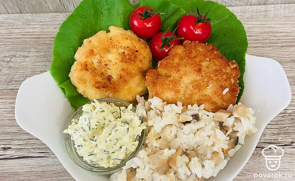 Котлеты хорошо сочетаются с любыми гарнирами и овощами. У меня сегодня на гарнир рис с грибами и свежие овощи. Соус можно подавать отдельно в соуснике. Приятного аппетита!