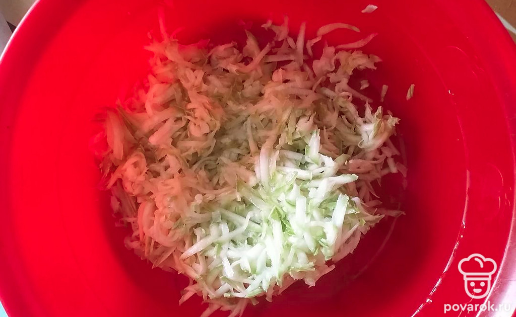 Готовый фарш солим, перчим, взбиваем яйцо, добавляем натёртый на крупной тёрке кабачок.