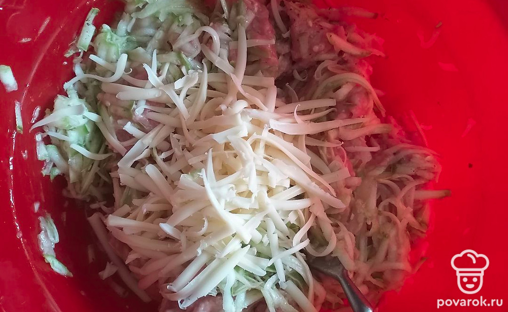 Добавляем натёртый сыр. Замешмваем фарш на биточки, добавляем в него пару ложек муки.