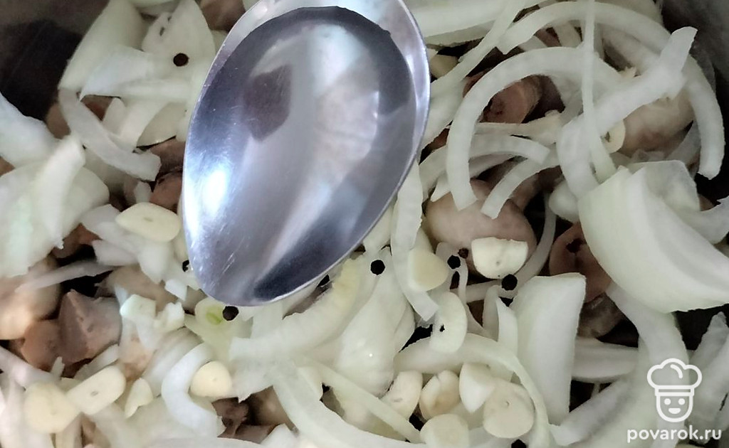 Нарежьте полукольцами лук, чеснок измельчите. Добавьте к грибам.