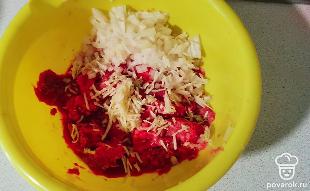 Лук порезать мелко, чеснок натереть на мелкой терке, добавить к фаршу.