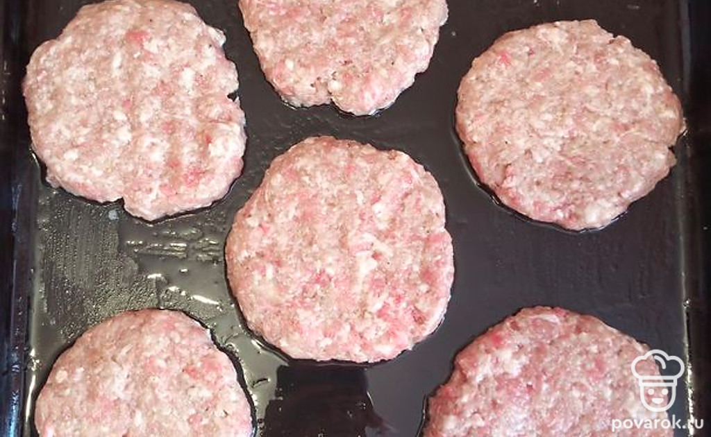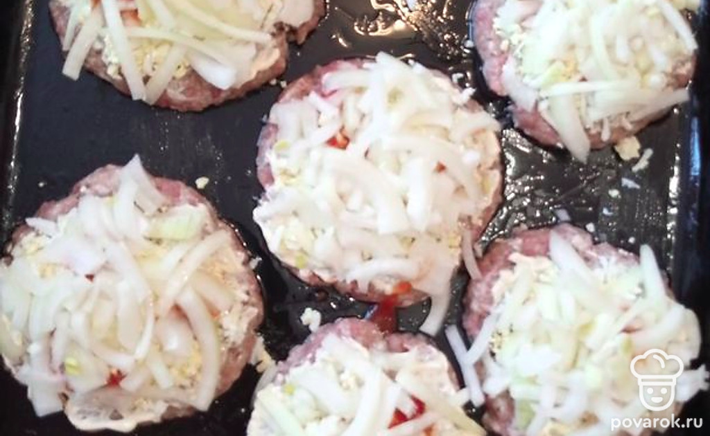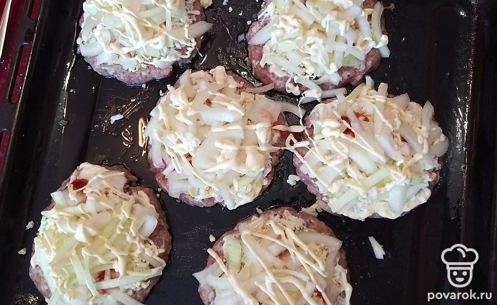 На лепешки фарша, выложить мелко порезанный, лук, смазать немного соусом.