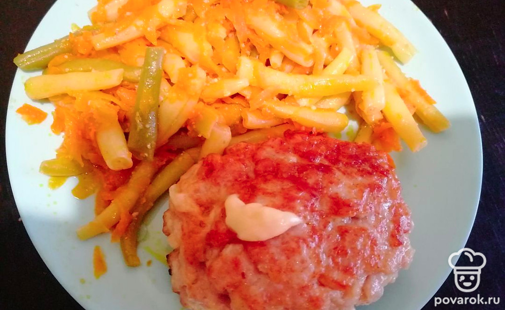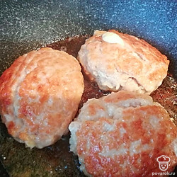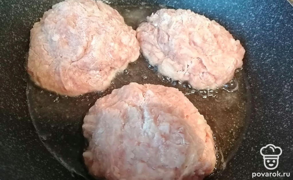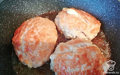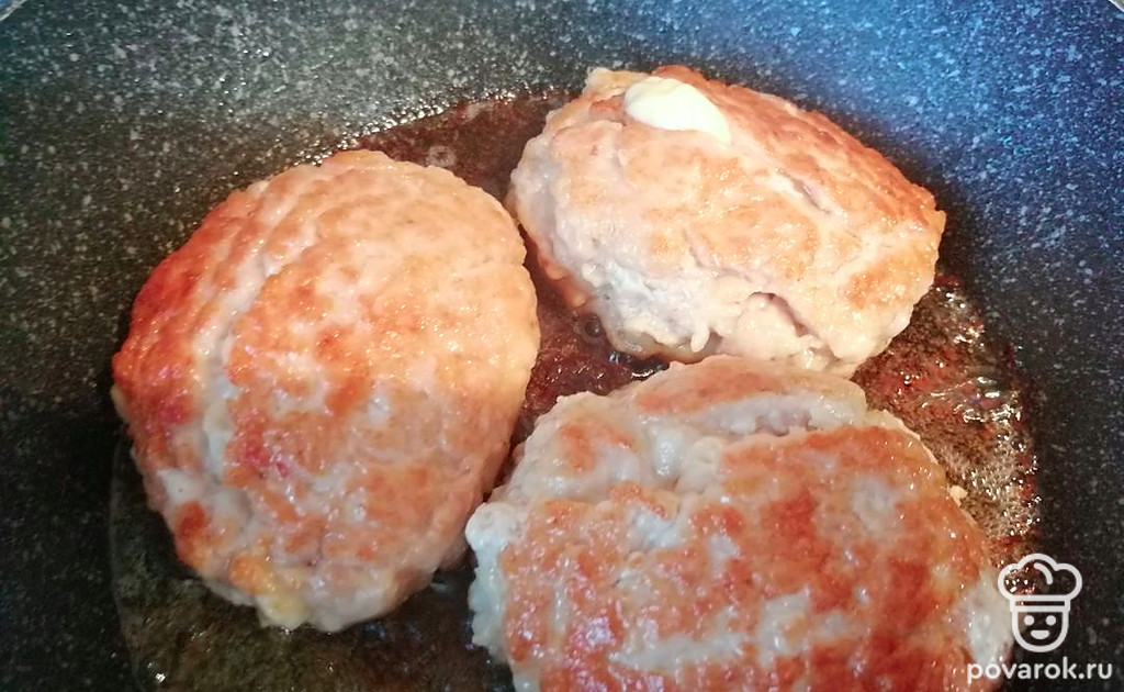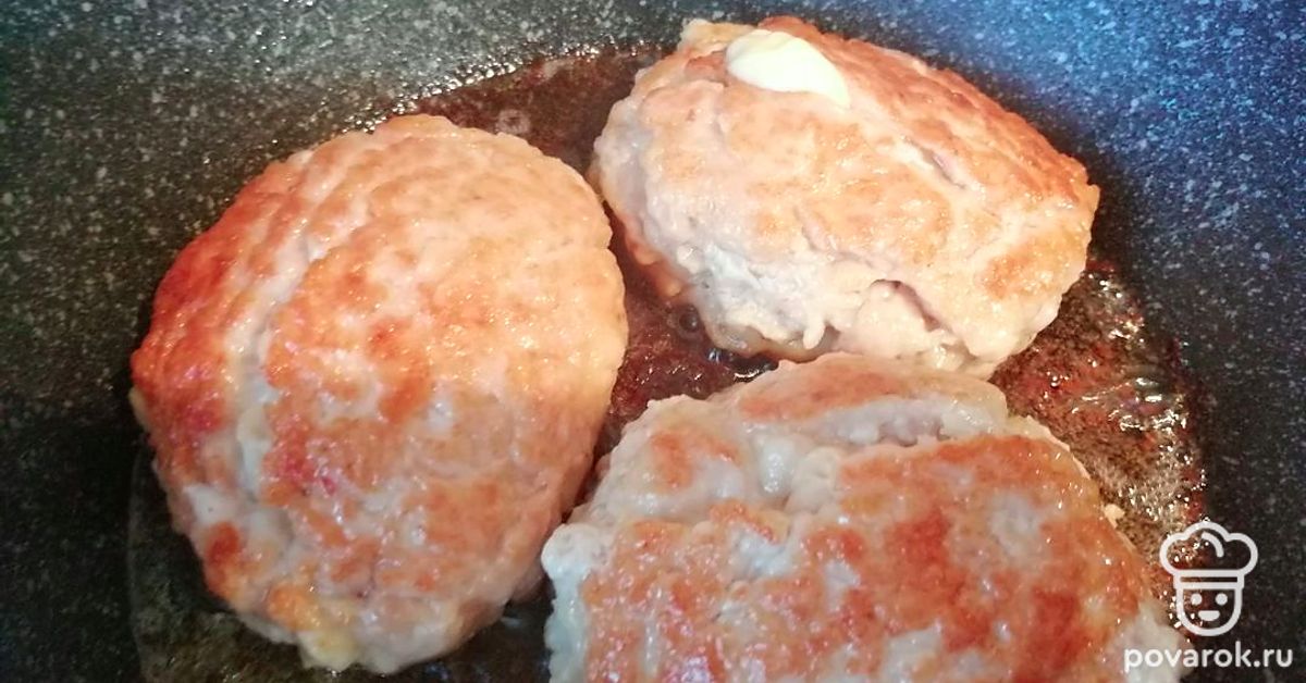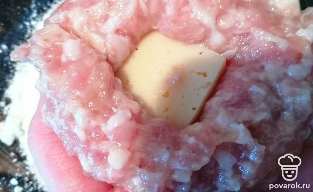Сформировать котлетку, внутрь завернуть кубик твердого сыра.