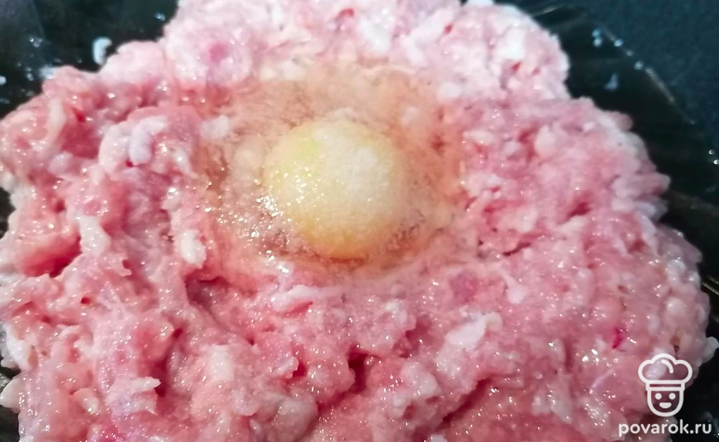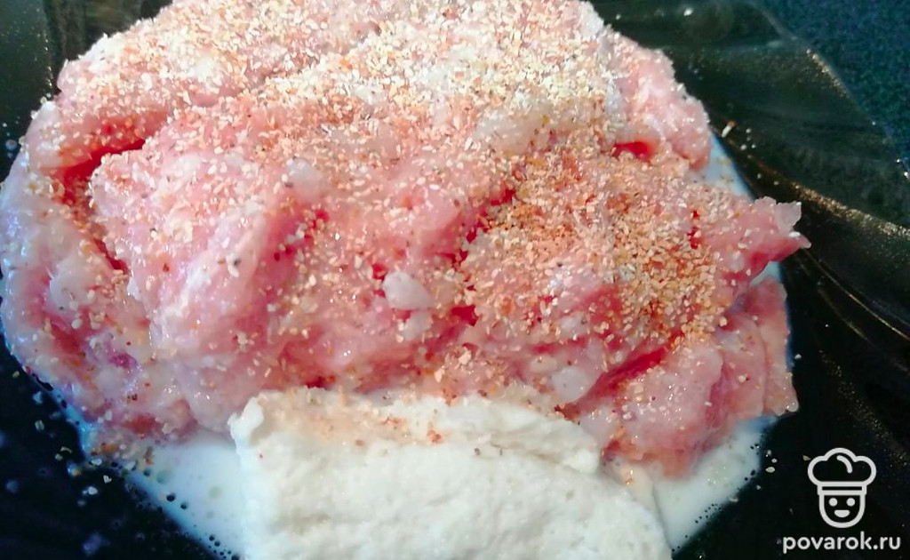 Мягкий белый хлеб замочить в молоке, добавить в фарш, посолить, добавить тертый лук и немного чеснока.
