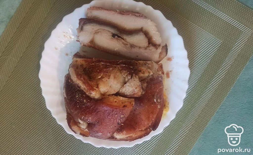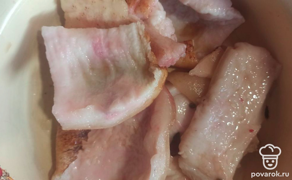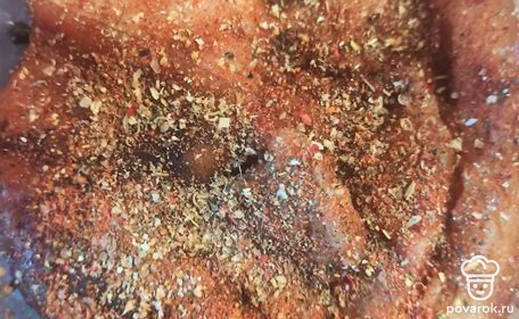 Выньте из рассола и выложите шкурки слоями. Пересыпьте специями: кориандром, перцем черным, сухой аджикой, приправой для мяса.