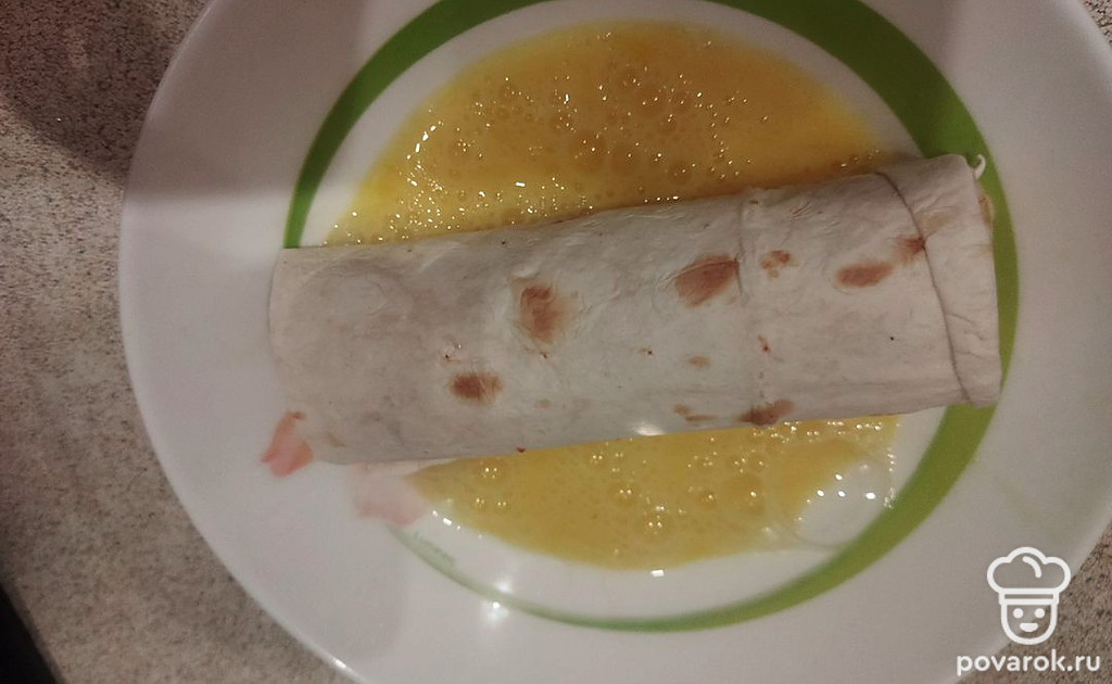 Сверните лаваш с сосиской и сыром в рулет. Обмакните его в взбитое куриное яйцо.