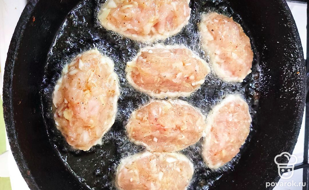Сформировать котлеты, жарить на хорошо разогретой сковороде с добавлением подсолнечного масла.