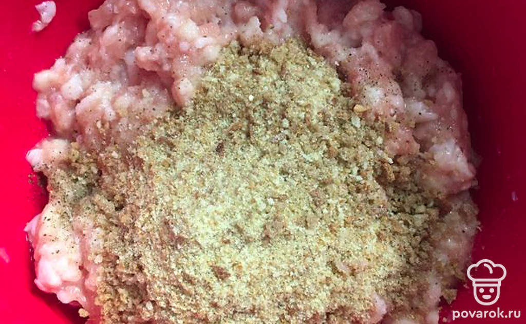 Я рекомендую заранее включить духовку на температуру 200 градусов, чтобы она у нас хорошо разогрелась. В Фарш добавляем соль и перец по вкусу, а также три столовые ложки панировочных сухарей.