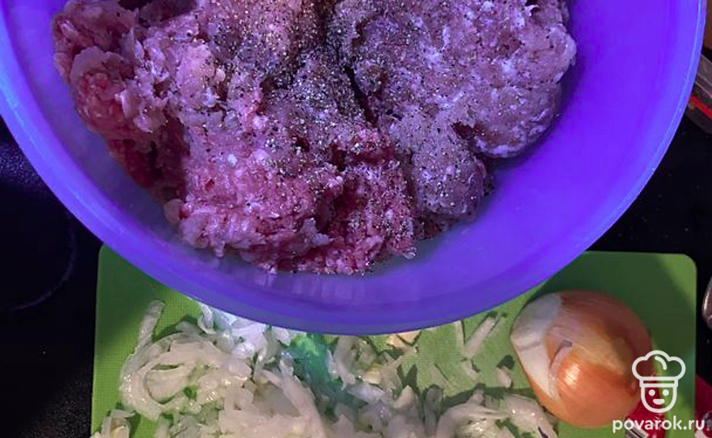 Оба вида фарша мешаем, добавляем соль, перец. Мелко режем лук, так же добавляем в фарш.