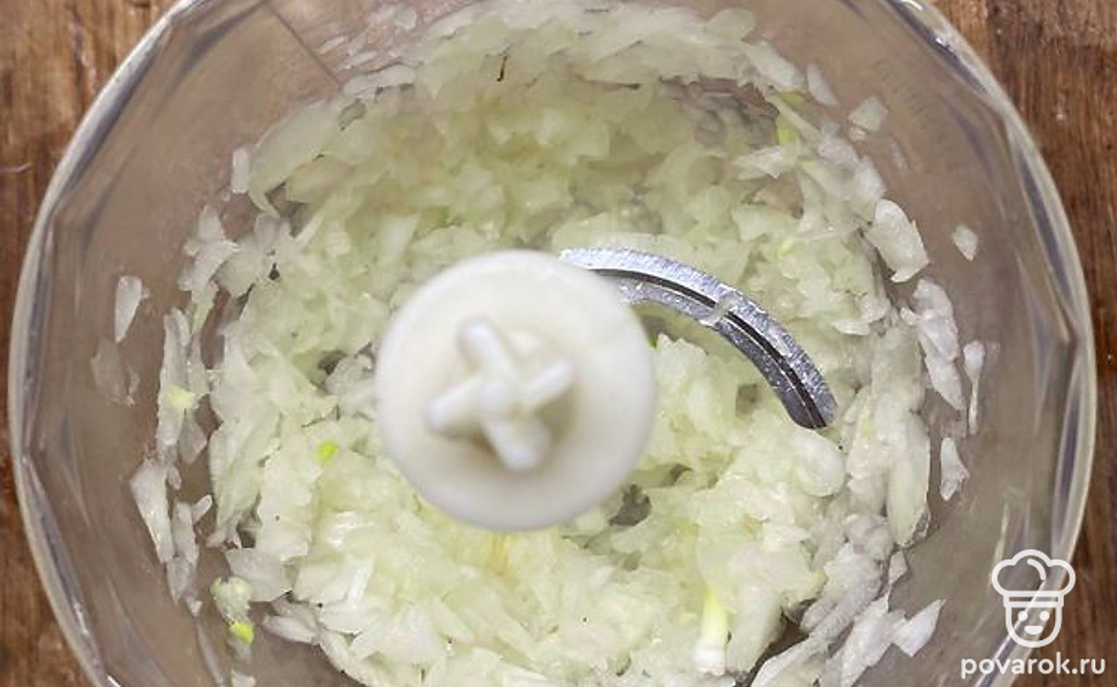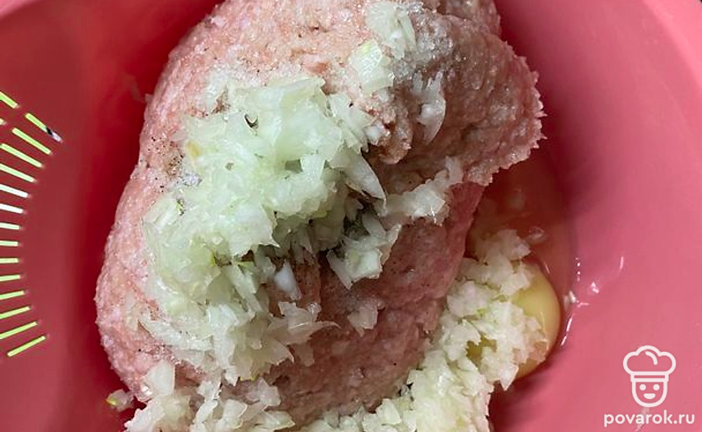 В ёмкость с фаршем вбейте яйцо, положите лук и специи.
