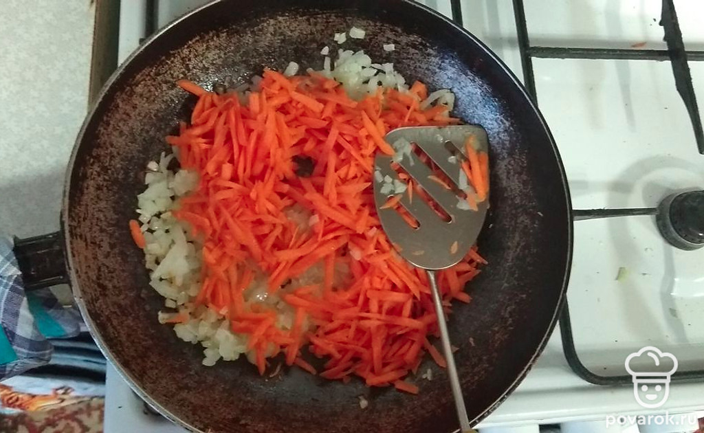 Следом выкладываем тёртую морковку. Обжариваем до готовности.