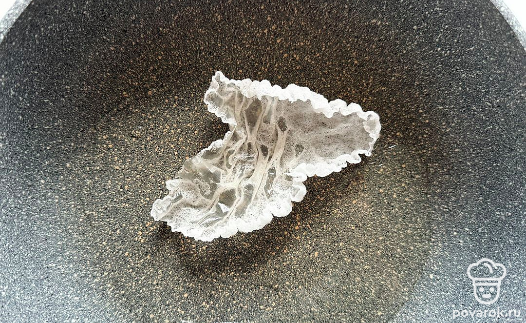 Разрежьте рисовую бумагу на 4 части. Хорошо разогрейте сковороду с маслом и выложите по одному кусочку разрезанной рисовой бумаги.
