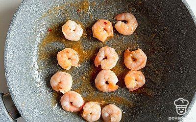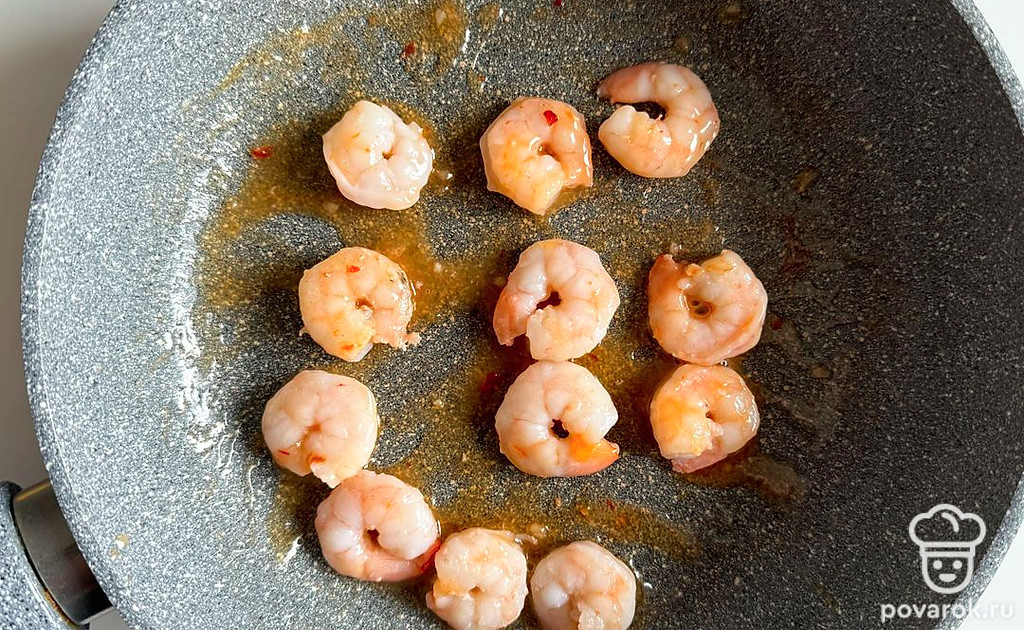 Креветки обжарьте до готовности несколько минут, добавьте сладкий соус чили и соль по вкусу. Перемешайте, дайте креветкам вобрать соус и снимите с огня.
