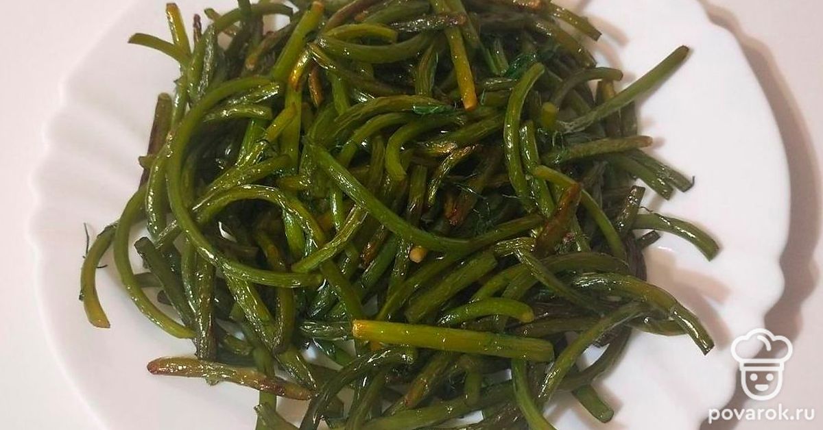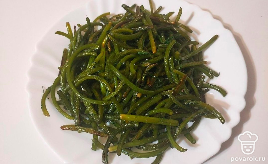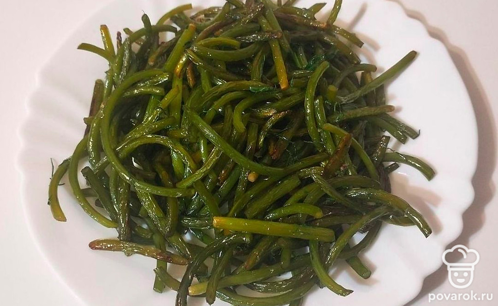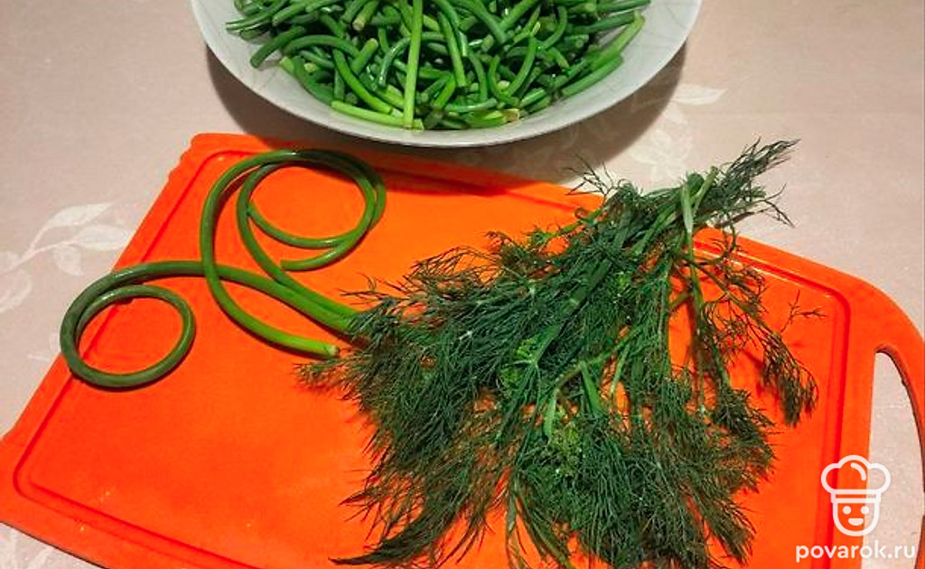 Добавьте рубленый укроп в конце готовки. Перемешайте и снимите с огня. Подавайте жареные чесночные стрелки горячими в качестве закуски или гарнира к мясу. По желанию можно добавить в блюдо кабачки и другие сезонные овощи. Приятного аппетита!