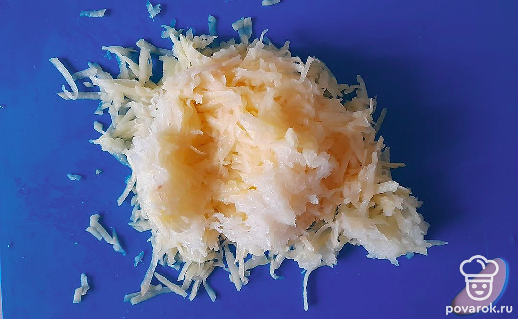 Натрите картофель и репчатый лук.